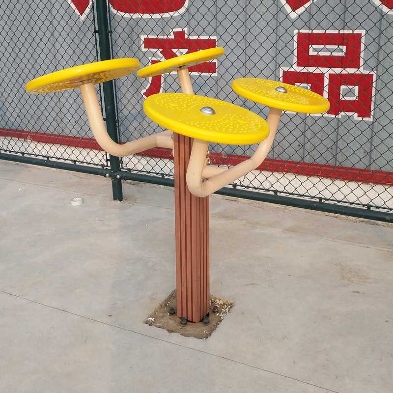 太極推盤也是一種常見的小區(qū)健身器材,它是由一根立桿加四個圓盤組成的。鍛煉的時候應(yīng)當身體直立或者蹲馬步,雙手握住轉(zhuǎn)盤的手柄,向相同或者相反的方向慢慢轉(zhuǎn)動,如同太極推手一般。它主要是鍛煉人的肩、肘、腕、膝等關(guān)節(jié)的活動能力。