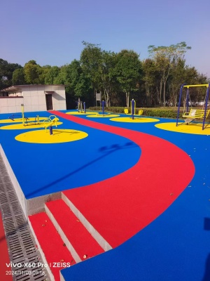 彩色塑膠健身步道搭配休閑健身器材,提升公園運動氛圍,防滑耐磨,兼具美觀與實用功能。