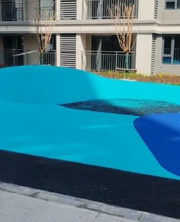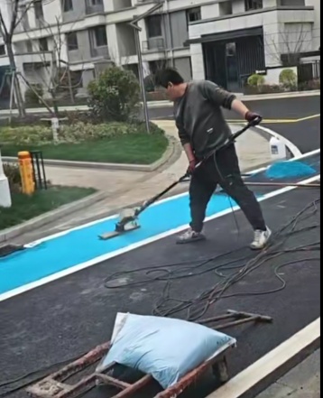 2. 分層攤鋪:按設(shè)計(jì)厚度(3-5mm)攤鋪,異形色塊/圖案用美紋紙/模具定位,分2次攤鋪(間隔4-6h),避免氣泡。